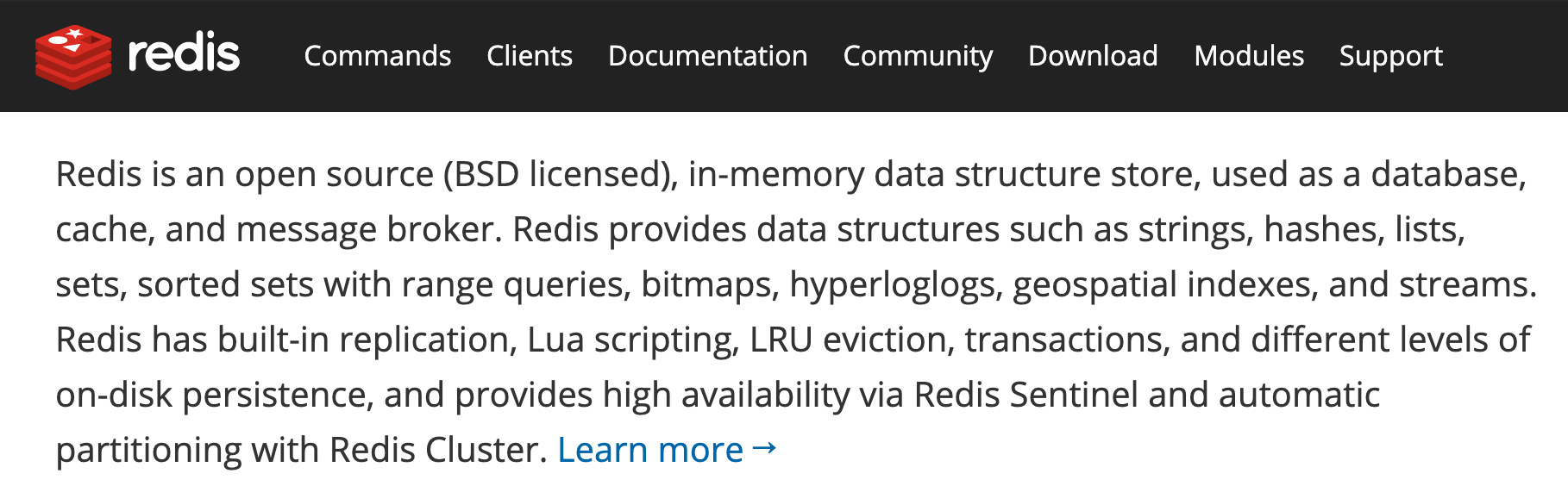Redis는 오픈소스(BSD License)이며, 데이터베이스로, 캐시로, 메시지 브로커로 사용되는 in-memory 자료구조의 저장소입니다. Redis는 string, hashes, list, set, sorted sets with range queries, bitmaps, hyperloglogs, geospatial indexes, 그리고 streams와 같은 자료구조를 제공합니다. Redis는 내장된 복제(Replication) 기능, Lua 스크립팅, LRU 정책(LRU eviction), 트랜잭션, 그리고 여러 디스크를 사용한 여러 레벨의 영속성을 갖고 있으며, Rdis Sentinel과 Redis Cluster를 사용한 자동 파티셔닝을 통해 높은 가용성을 제공합니다.