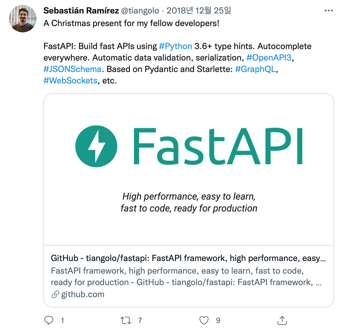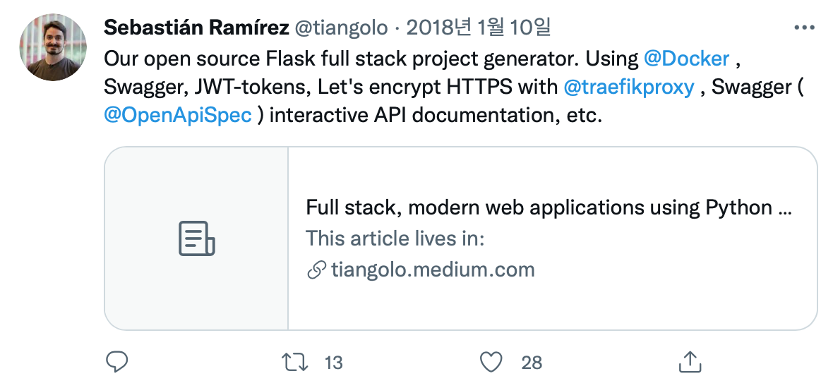 Tiangolo 를 보다보니 Mac 의 필수 도구가 돼버린, brew 를 만든 개발자를 처음 접했을 때의 느낌이 난다. 도구 그 자체로는 엄청난 기술을 가진것은 아니지만, 수많은 사람들의 문제를 해결했고 사랑받는 도구를 만들어냈다.