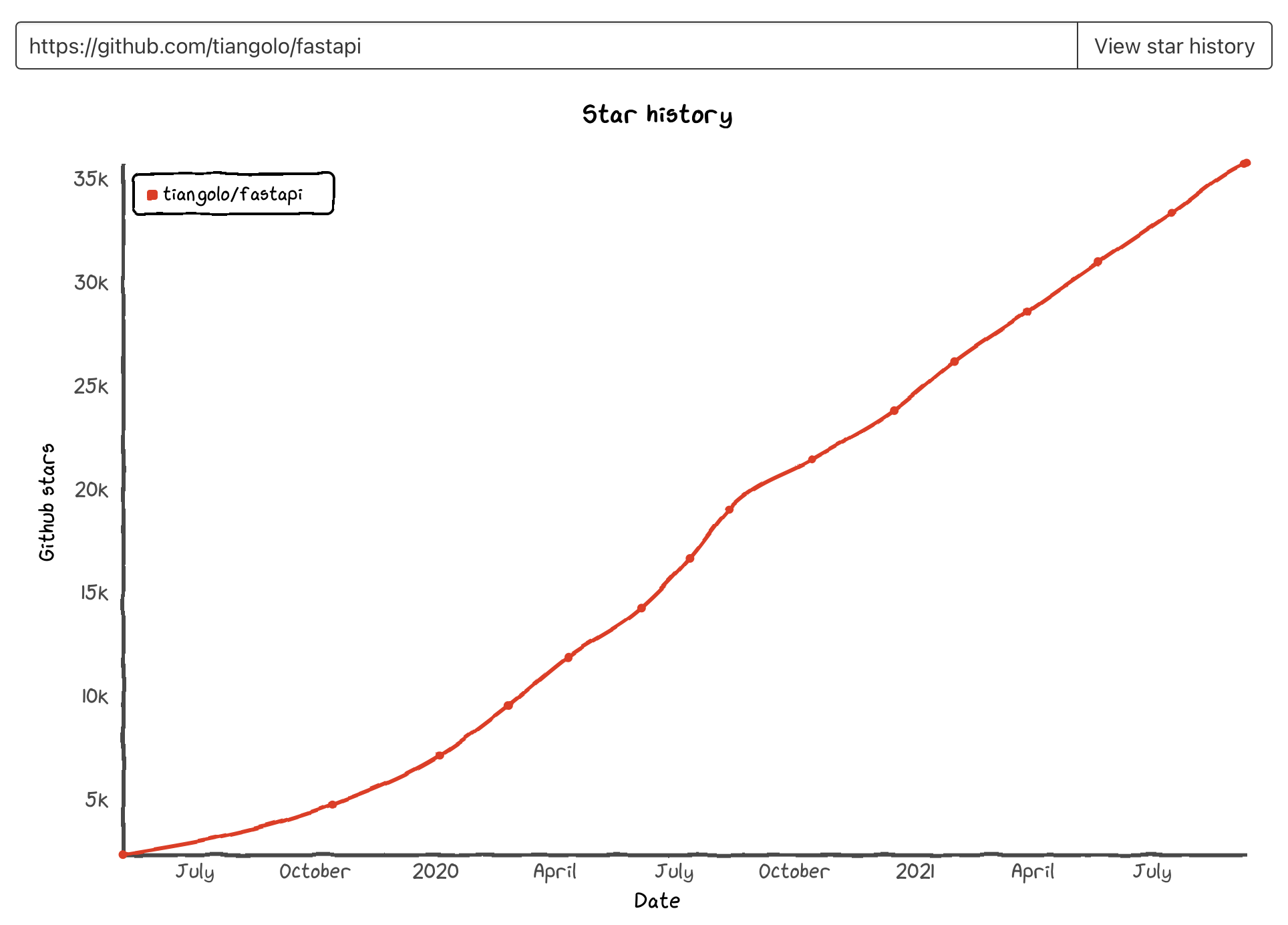 이 날이 FastAPI 를 처음 공개한 날인지는 모르겠는데, 생각보다 트윗에서의 반응은 저조해서 놀랐다. 그래서 github star history 그래프를 보기로 했다.