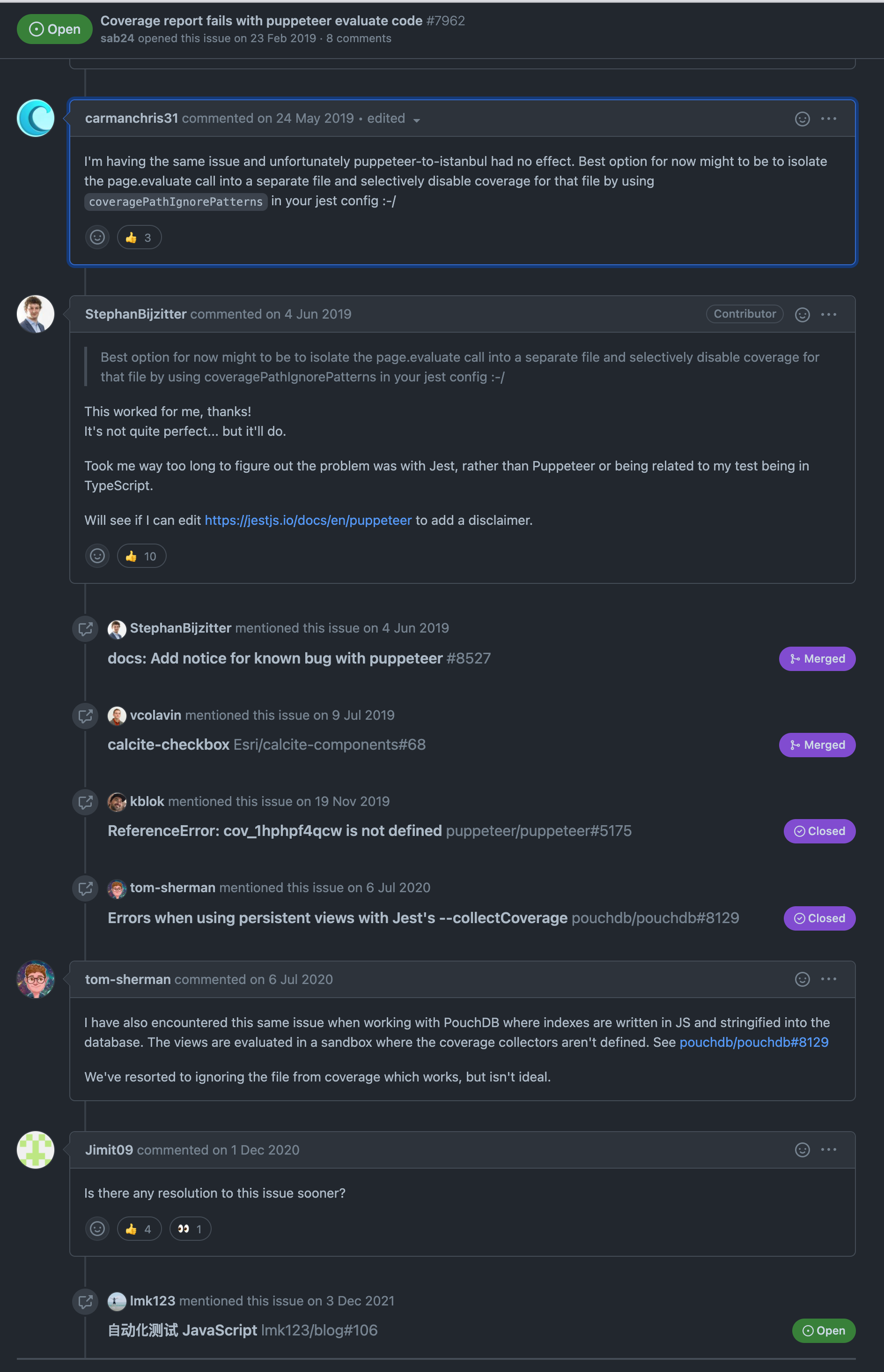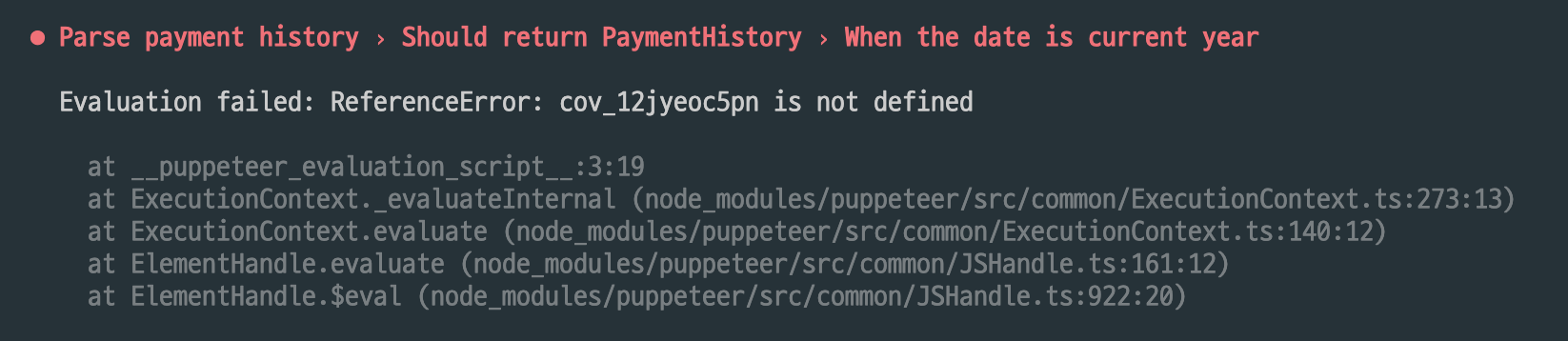 page.$eval,page.$$eval,page.evaluate중 하나를 사용한다면, 앞에서 언급한 함수로 넘겨진 함수가 Jest 의 Scope 를 벗어납니다. 따라서 Puppeteer 를 사용하는 테스트 파일이 있을 경우 코드 커버리지를 생성하는것은 현재로썬 불가능합니다. issue #7692 에서 진행 상황을 확인할 수 있습니다.
