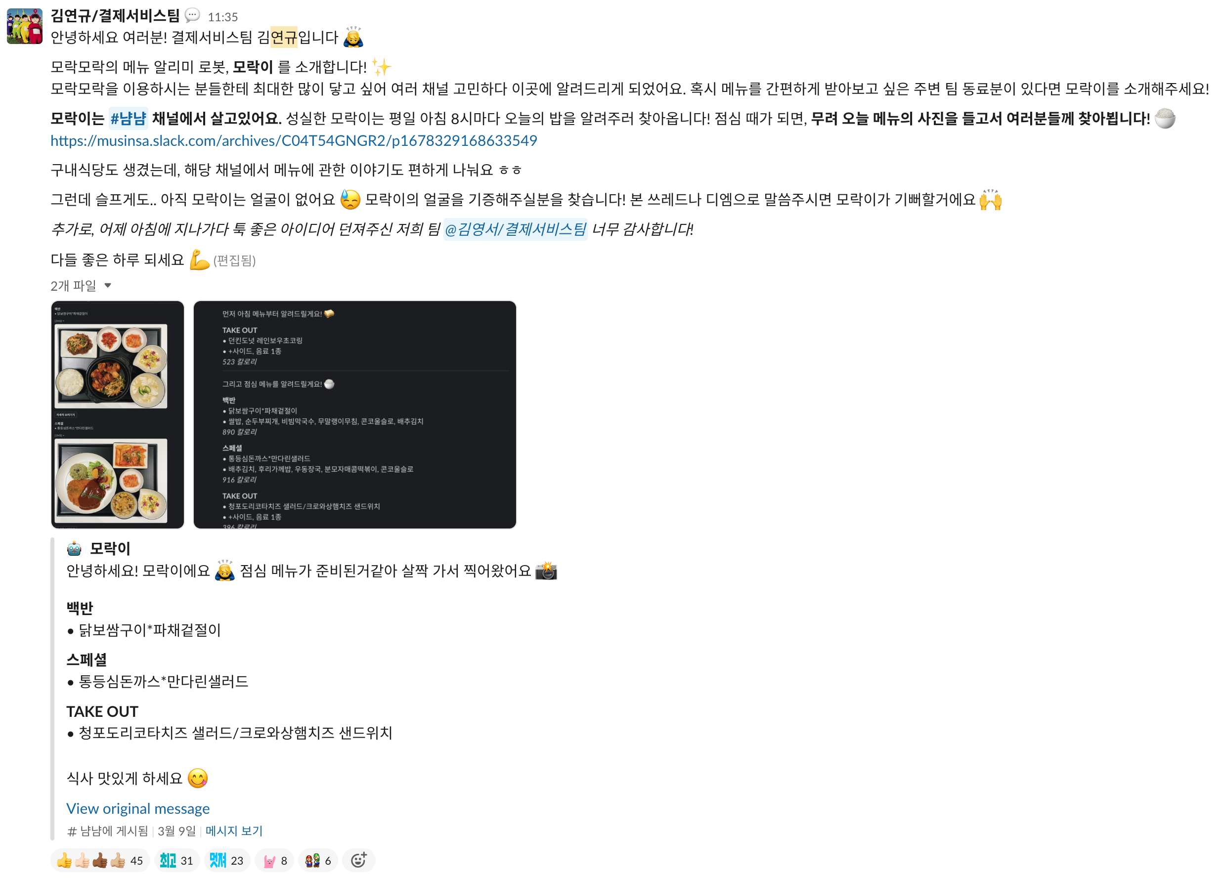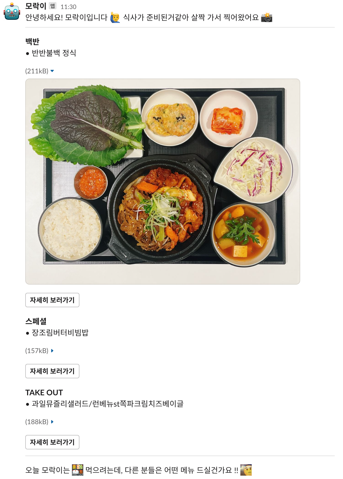그리고 공개한 이후에, 몇 가지 재미있는 이모지를 만들어주셔서 오늘 모락이가 어떤 메뉴를 먹을 건지도 담을 수 있게 되었습니다.
