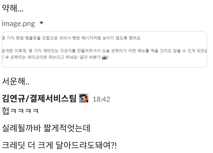 - 슬랙 메시지라고 해서 가독성 신경 안 쓰고 문자만 보내면 너무 칙칙할 거 같아.