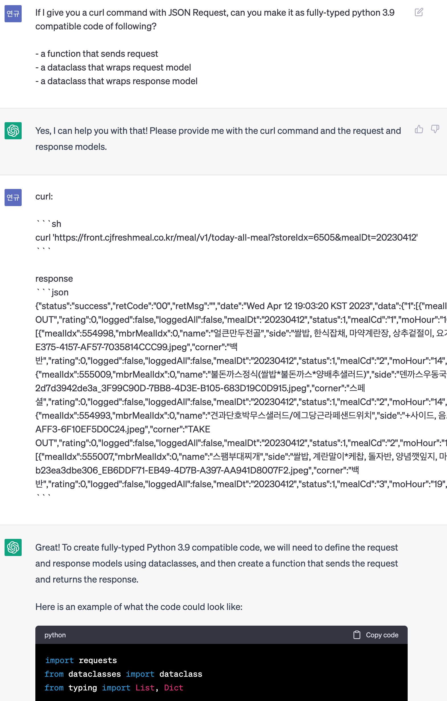 내가 점심 메뉴 요청 명령어와 응답값을 보내줄 테니 python 코드로 짜줄래?